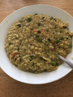 Dry roast the oats in a pan, let it cool. In the same pan add butter and oil, once butter melted, add mustard seeds, channa dhal. After mustard seeds started to splutter, add Cinnamon, cloves, onion,tomato and green chilies, saute well. Now add the vegetables, turmeric powder and salt. Saute well. Add 4 cups of water. Since we are using 2 cups of oats, adding 4 cups of water, like 1:2 ratio. Once water started to boil add oats and let it cook with the lid, until we get the kitchadi consistency. Squeeze lemon and mix well. Garnish with coriander leaves.